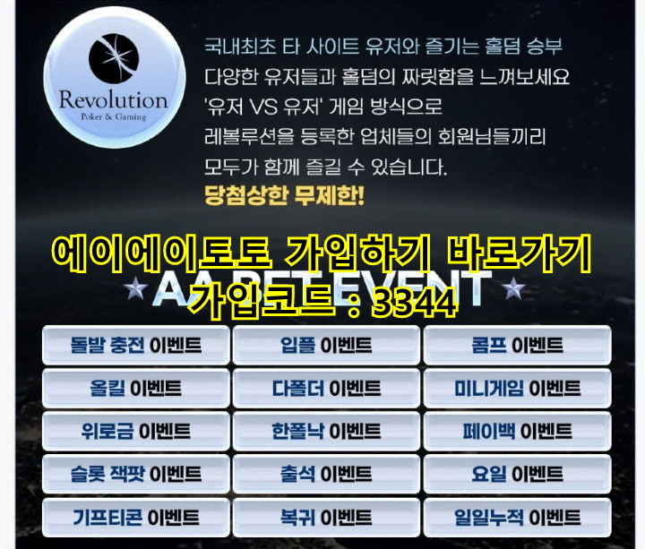 국내최초 타 사이트 유저와 즐기는 홀덤 승부 – 다양한 유저들과 홀덤의 짜릿함을 느껴보세요 / 유저 VS 유저 게임 방식으로 레볼루션을 등록한 업체들의 회원들 끼리 모두가 함께 즐길 수 있습니다. ( 당첨상한 무제한! ) 엠카주소